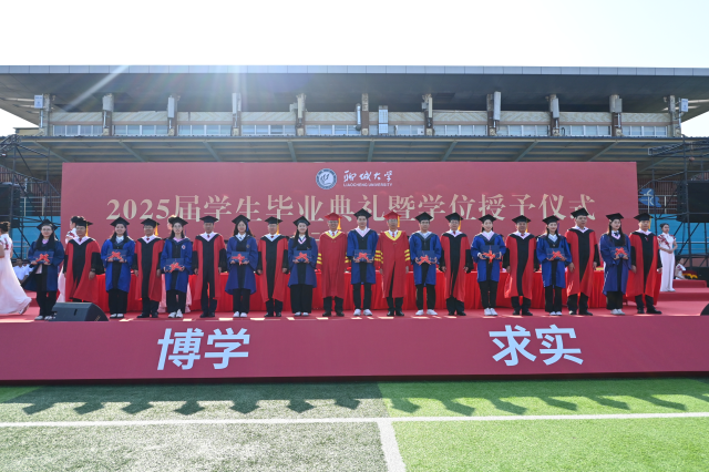 校领导、学位委员会成员为全日制本科生、硕士研究生、继续教育本科毕业生代表颁发毕业证书和学位证书,拨正流苏,合影留念。学校党委领导班子成员为2025届优秀毕业生代表和西部计划志愿者代表颁发证书。