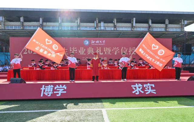 党委书记关延平为2025年西部计划志愿服务团、研究生支教团授旗。今年,243名优秀毕业生入选2025年大学生志愿服务西部计划,24名研究生入选第二十七届研究生支教团。他们庄严宣誓,唱响《到西部去》,表达了投身基层,为祖国西部建设贡献青春智慧和力量的决心。